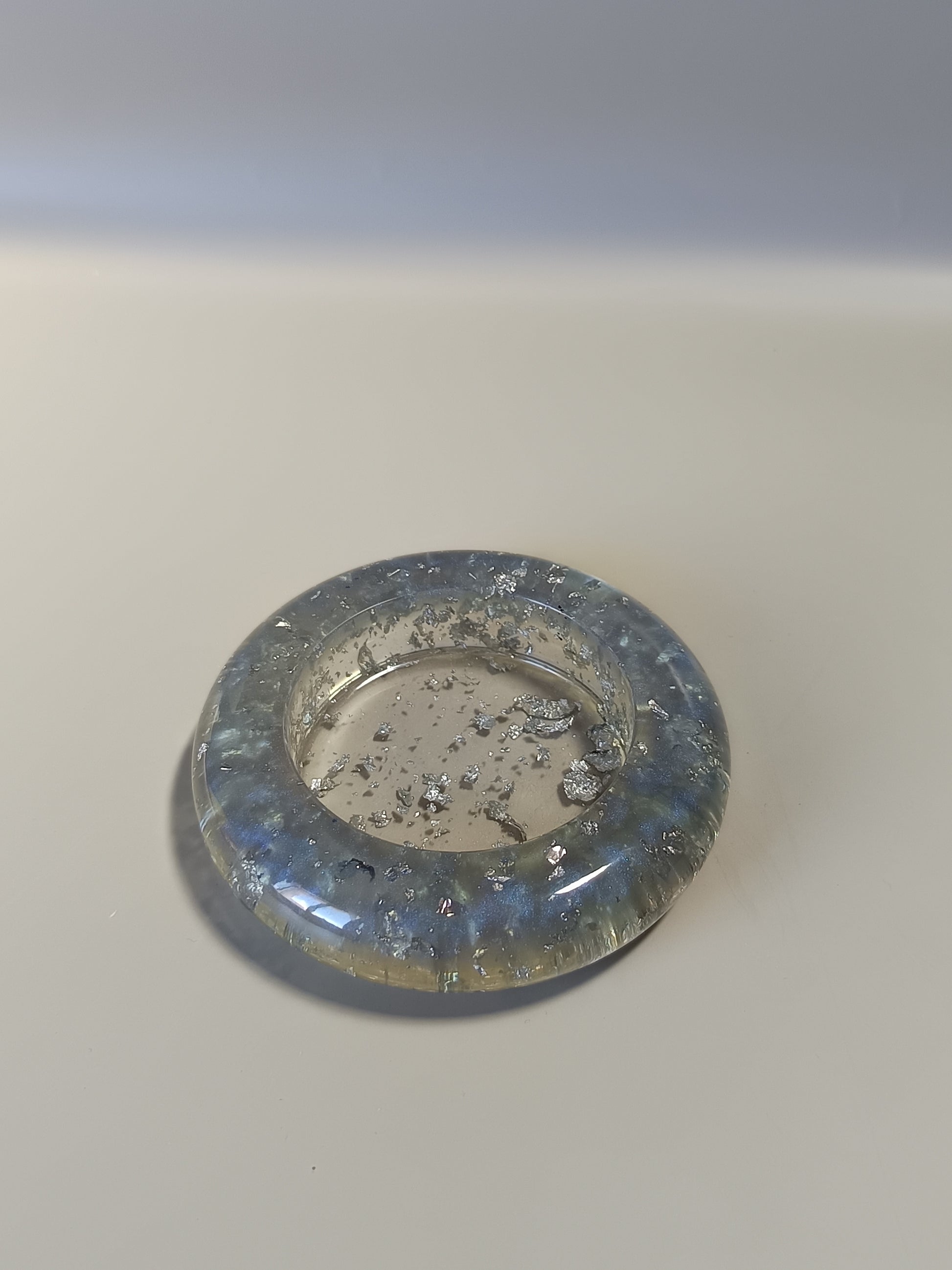 Bougeoir rond transparent avec feuilles argentées 8*8 cm