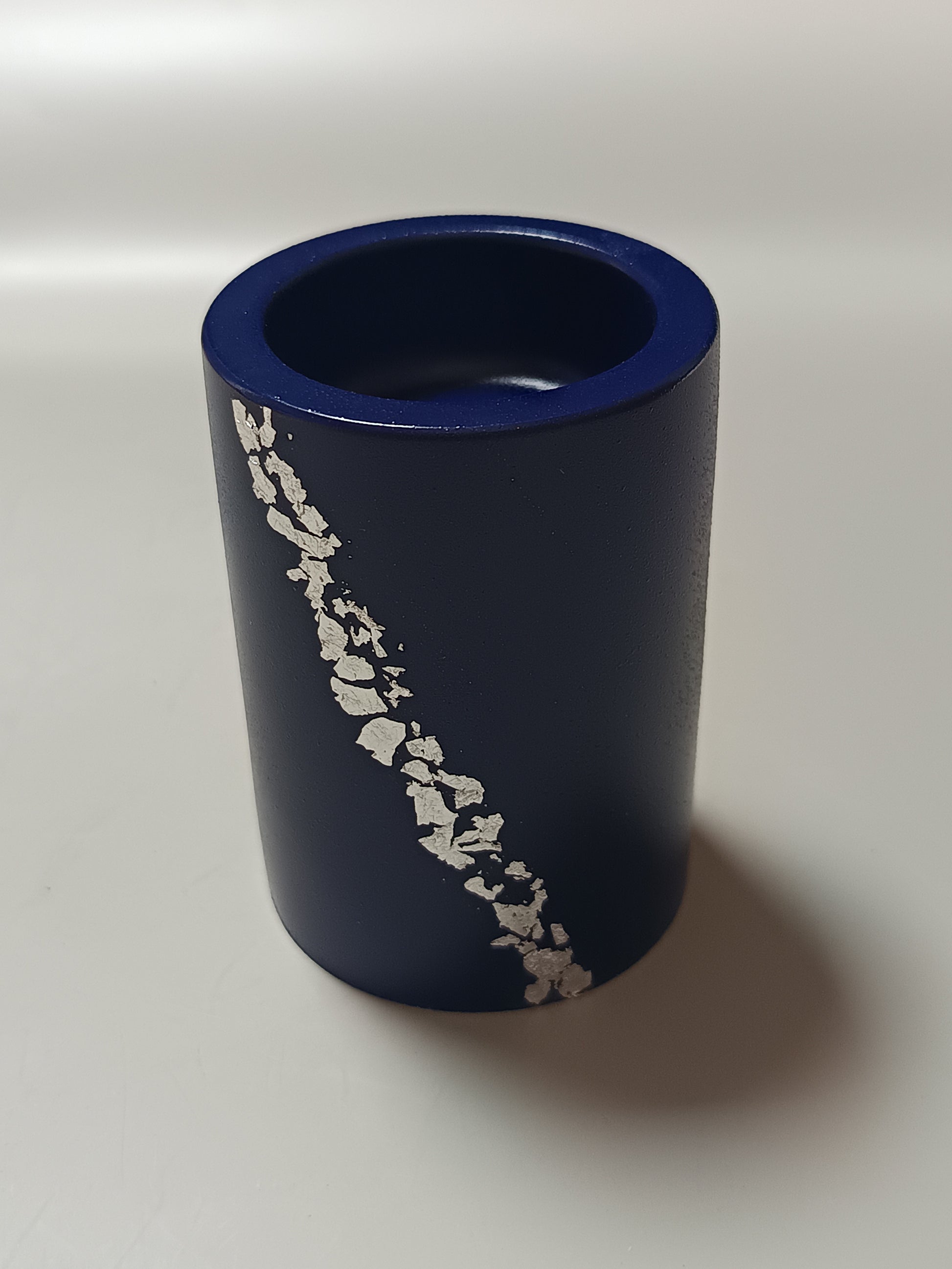Bougeoir bleu foncé avec ses feuilles argentées.