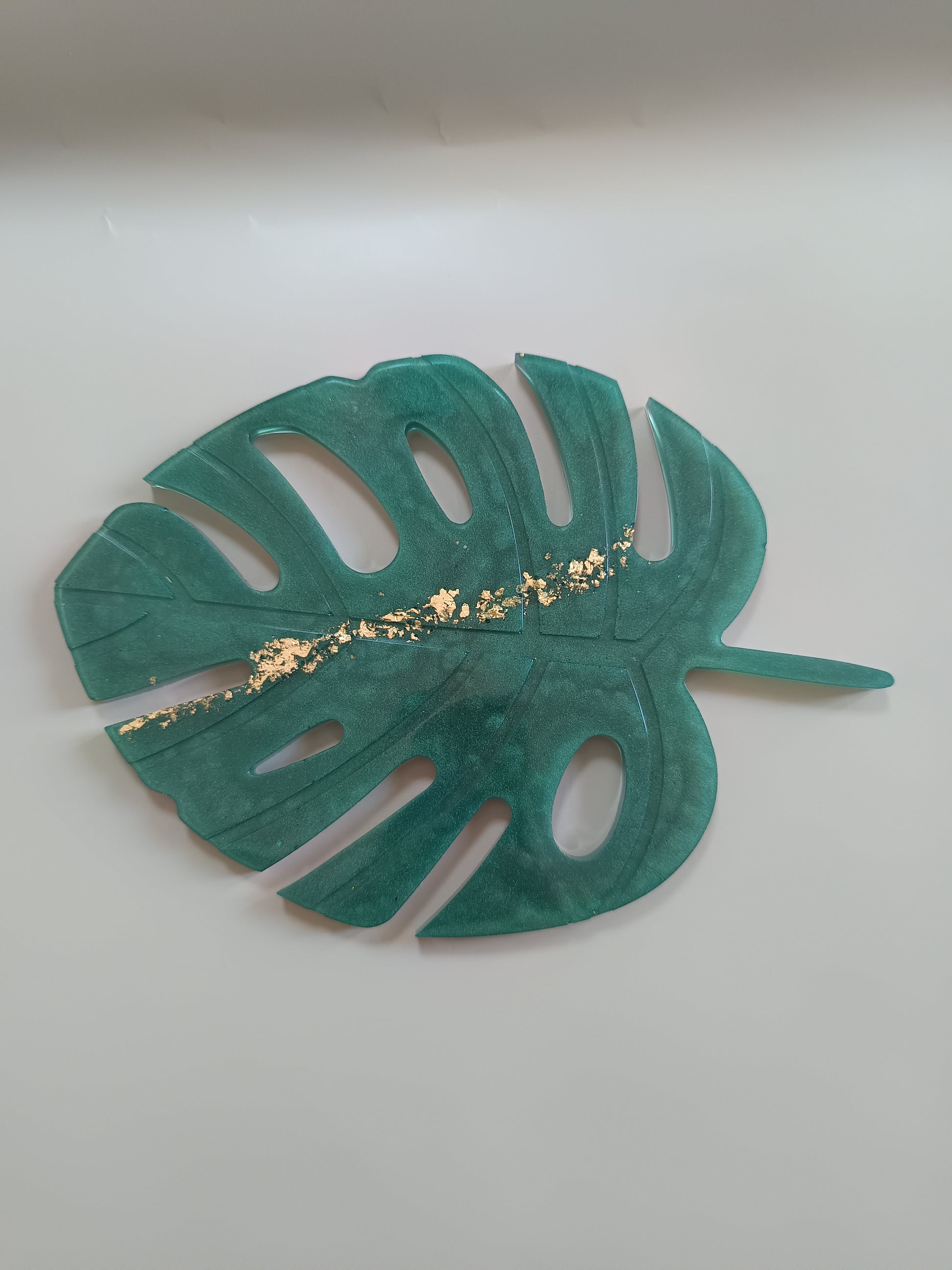 Plateau feuille en résine époxy verte et feuilles d'or pour décoration.